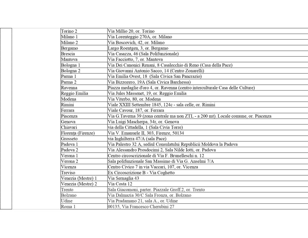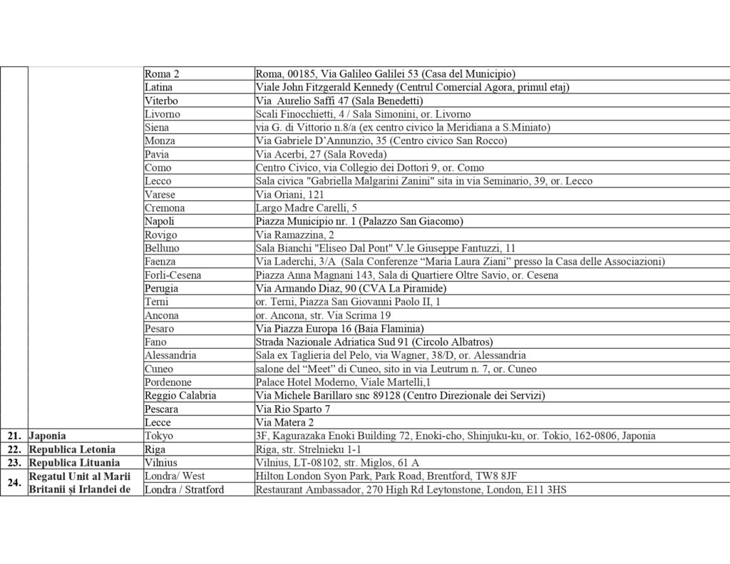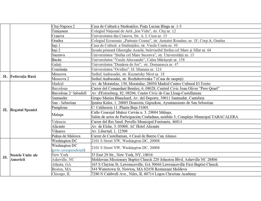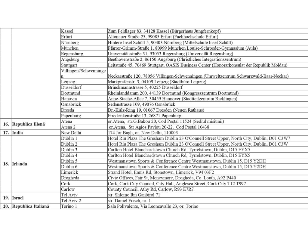 Центральная избирательная комиссия Республики Молдова представила список избирательных участков за рубежом на президентских выборах и Референдуме 2024 года. Они будут открыты в 37 странах, наибольшее число в Италии — 60, далее следует Германия — 26, Франция — 20, Румыния — 16. По одному избирательному участку будет открыто в 10 странах, по два — в 16, среди них Австория, Россия, Украина, Турция.